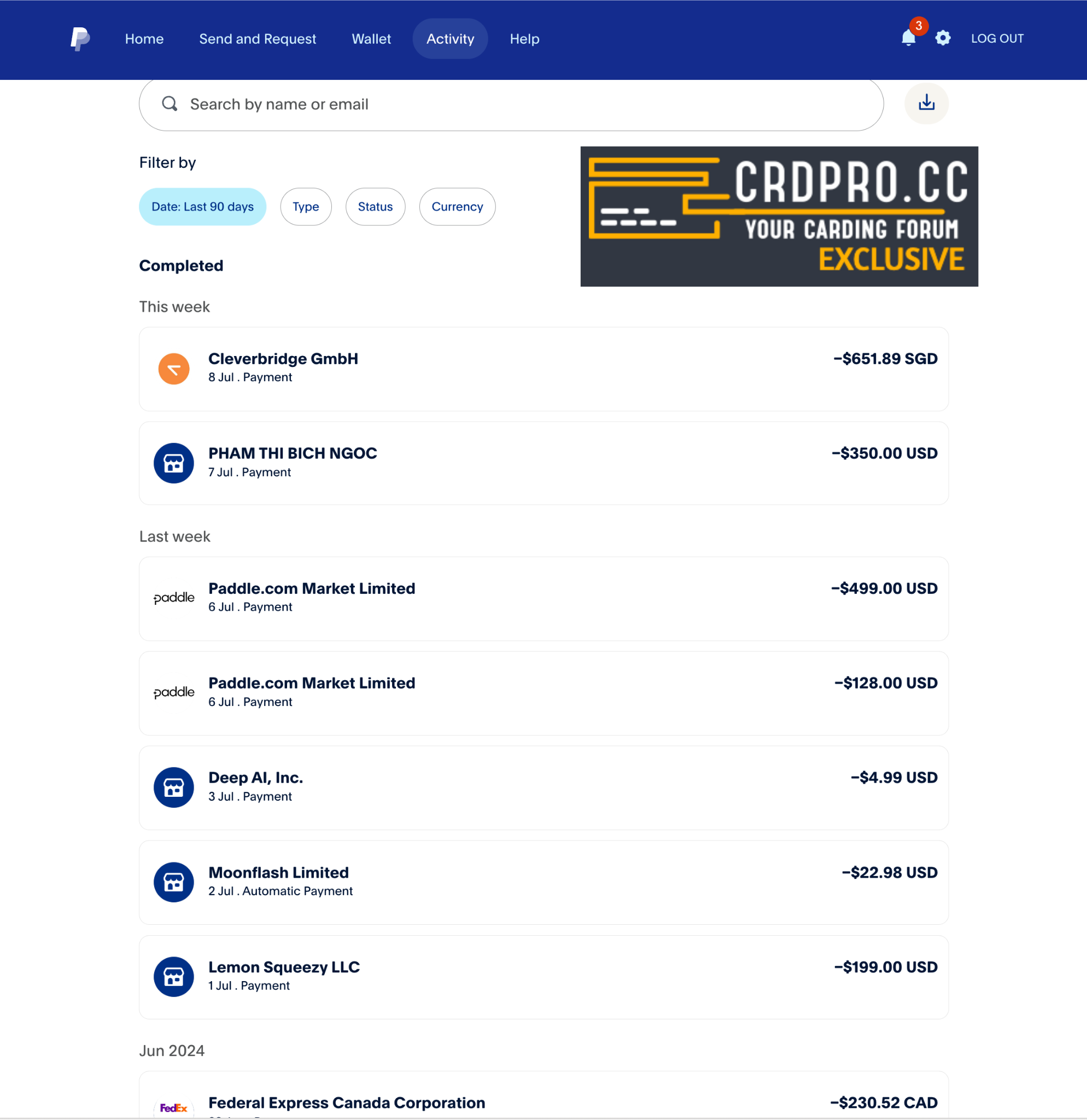 Let's take a look at the activity history of one of my many PayPal accounts for this week:
