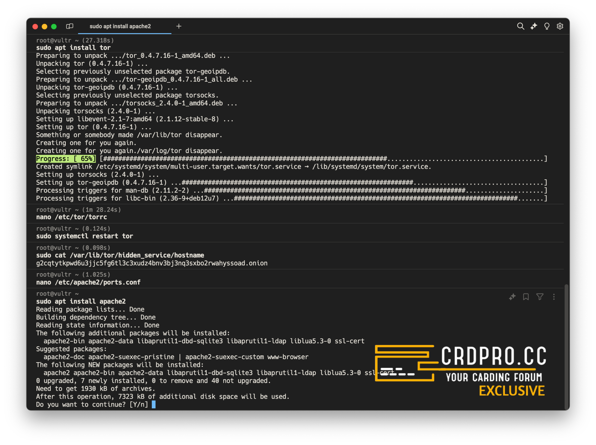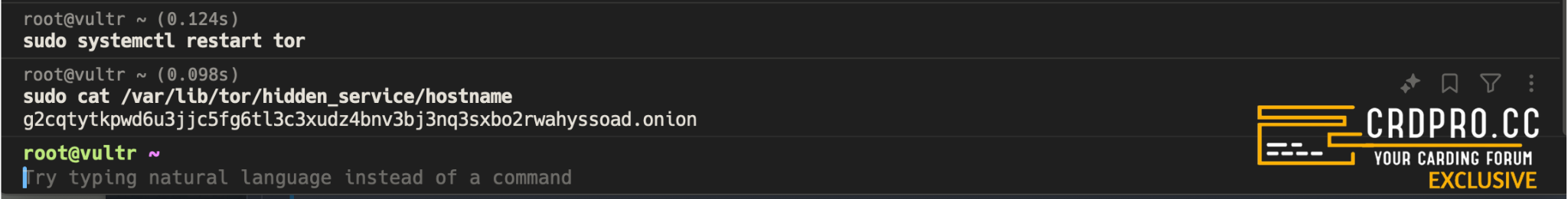 This spits out your .onion address. Guard this with your life. It's your server's new address in the darkweb.