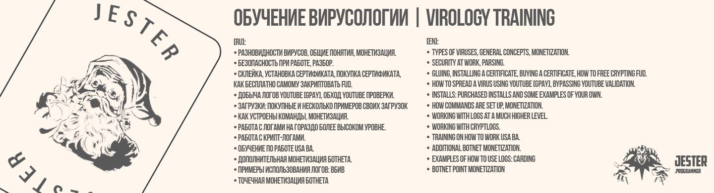 Пройдя курс вы получите очень много полезных знаний, научитесь наконец работать правильно с вирусами, держать свои ботнеты, добывать трафик и получите место в команде.