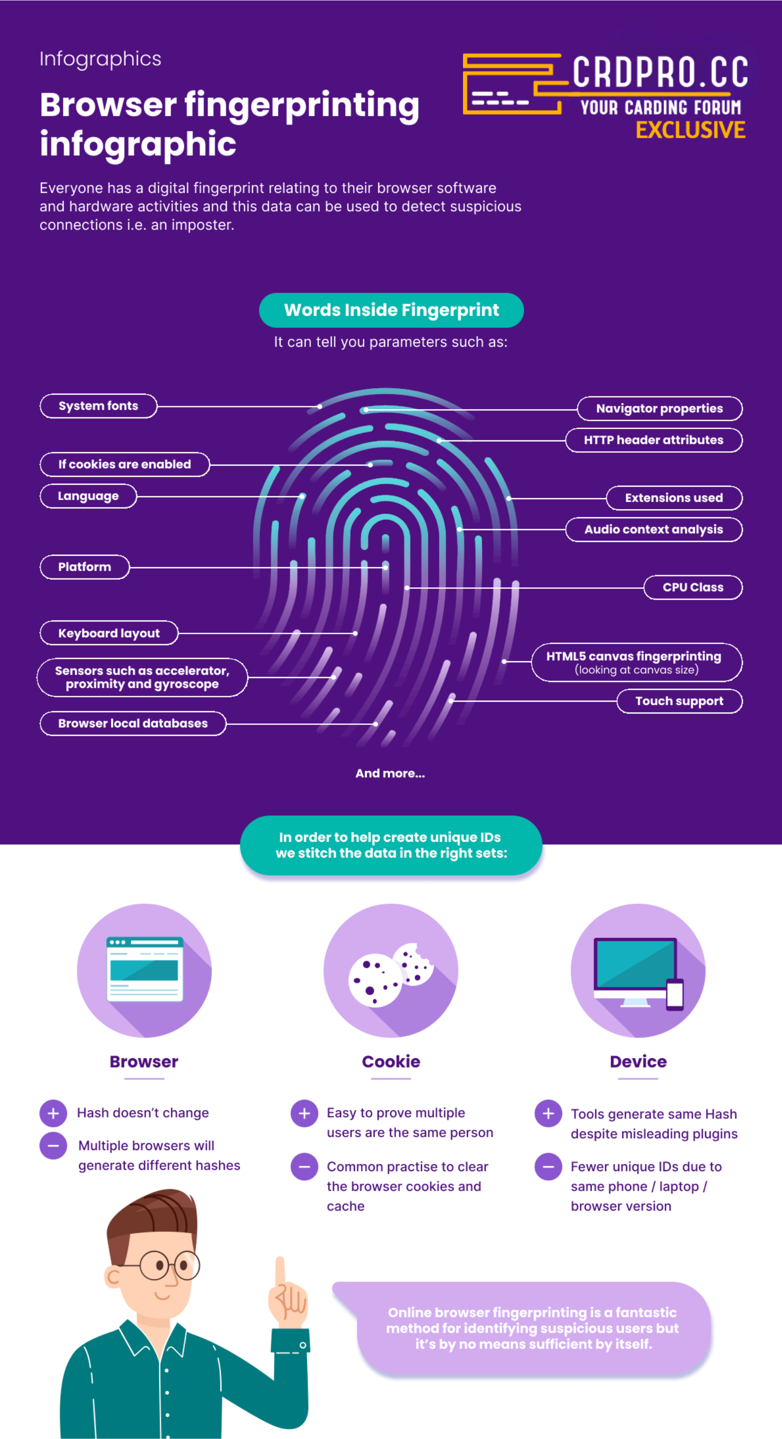 Fraud detection systems correlates all this fingerprint soup with purchases and activities. They look for patterns, anomalies, and sudden changes. If you usually buy crap in Ohio using a certain type of fingerprint, but then that fingerprint is used to make high-value purchases from Miami, well, now you have problems.